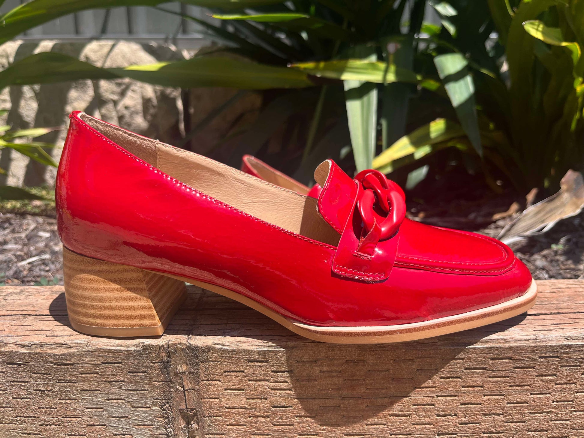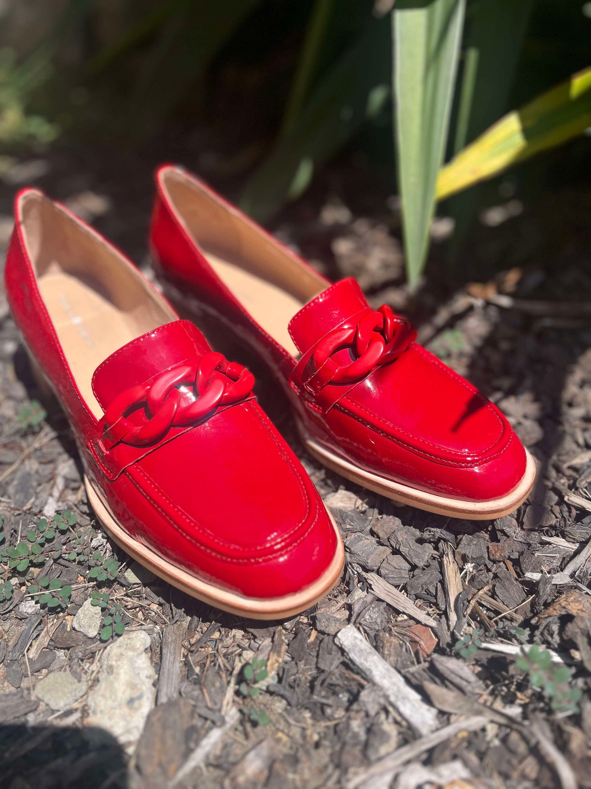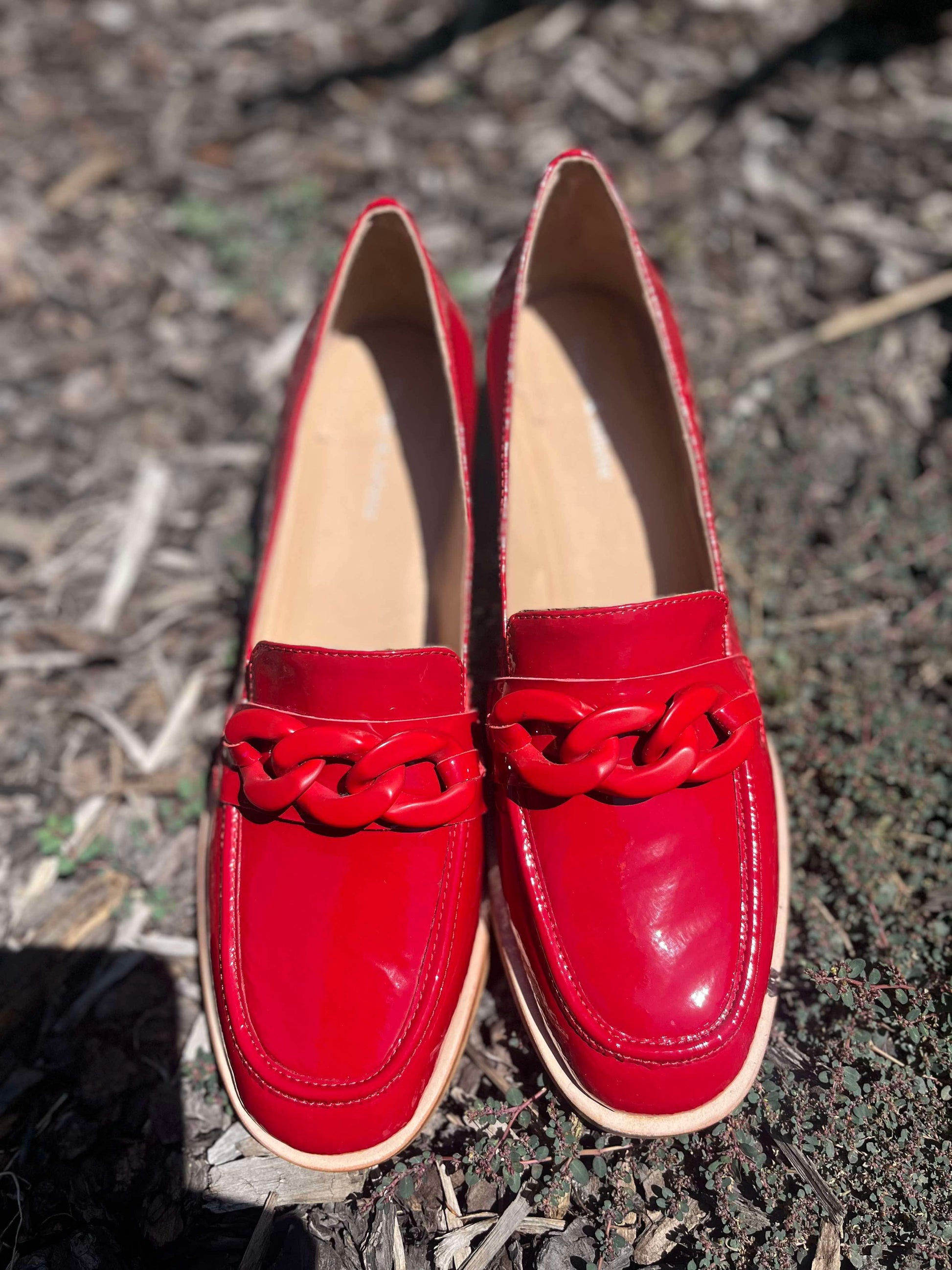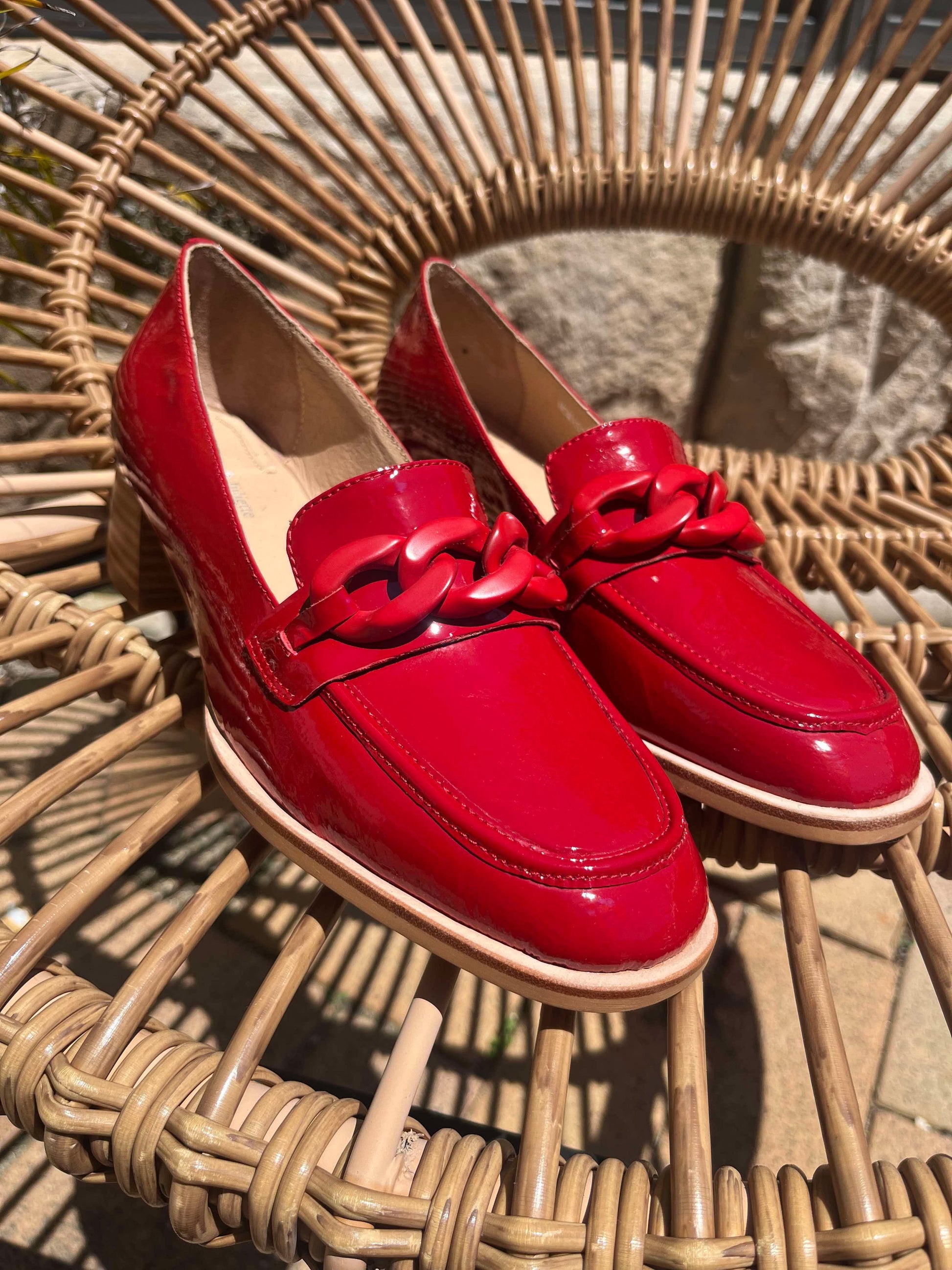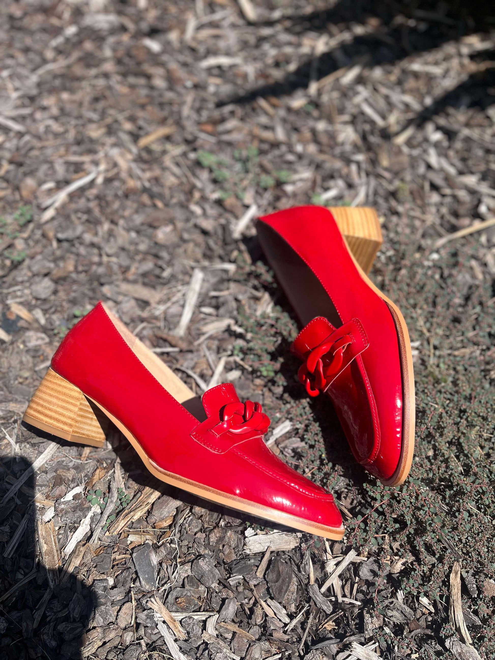 These red patent leather loafers with a stacked block heel from NOMASS by Django & Juliette are the perfect addition to your desk-to-dinner wardrobe.