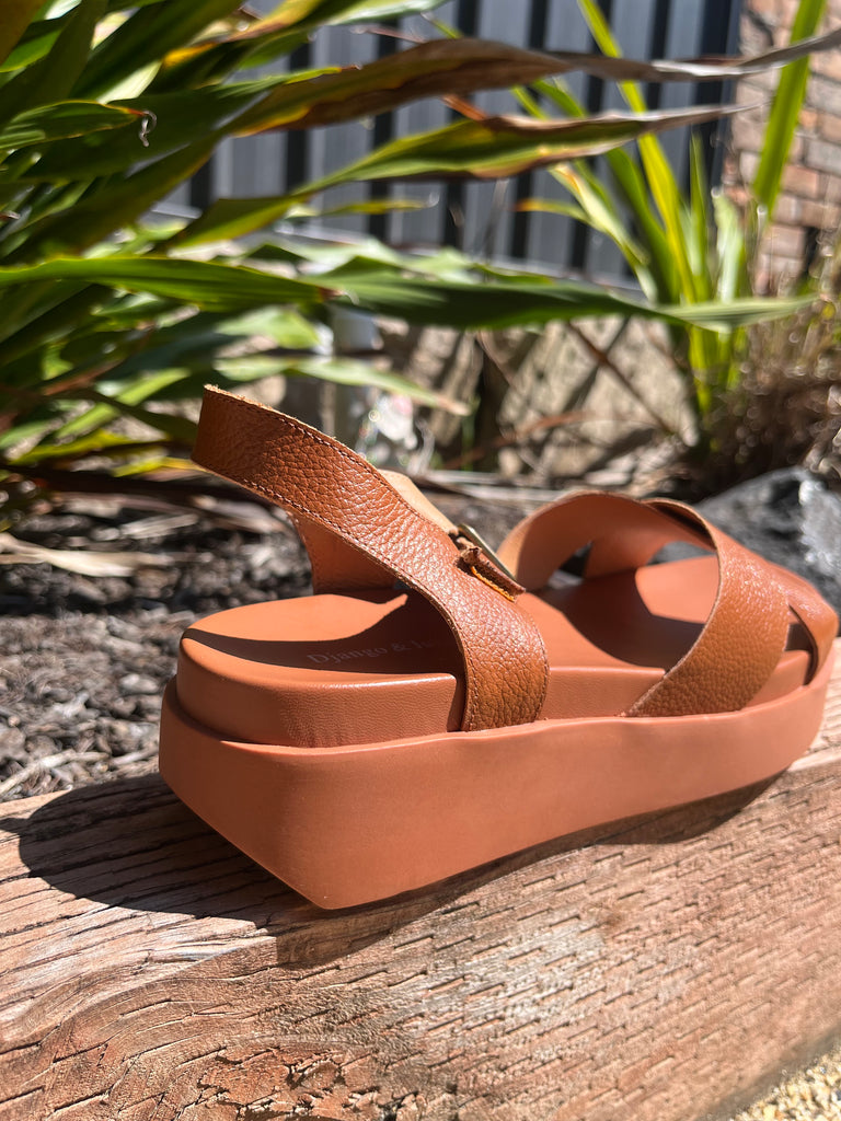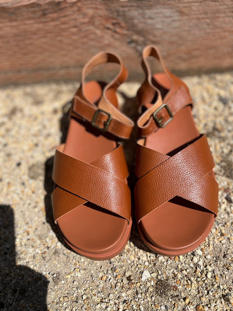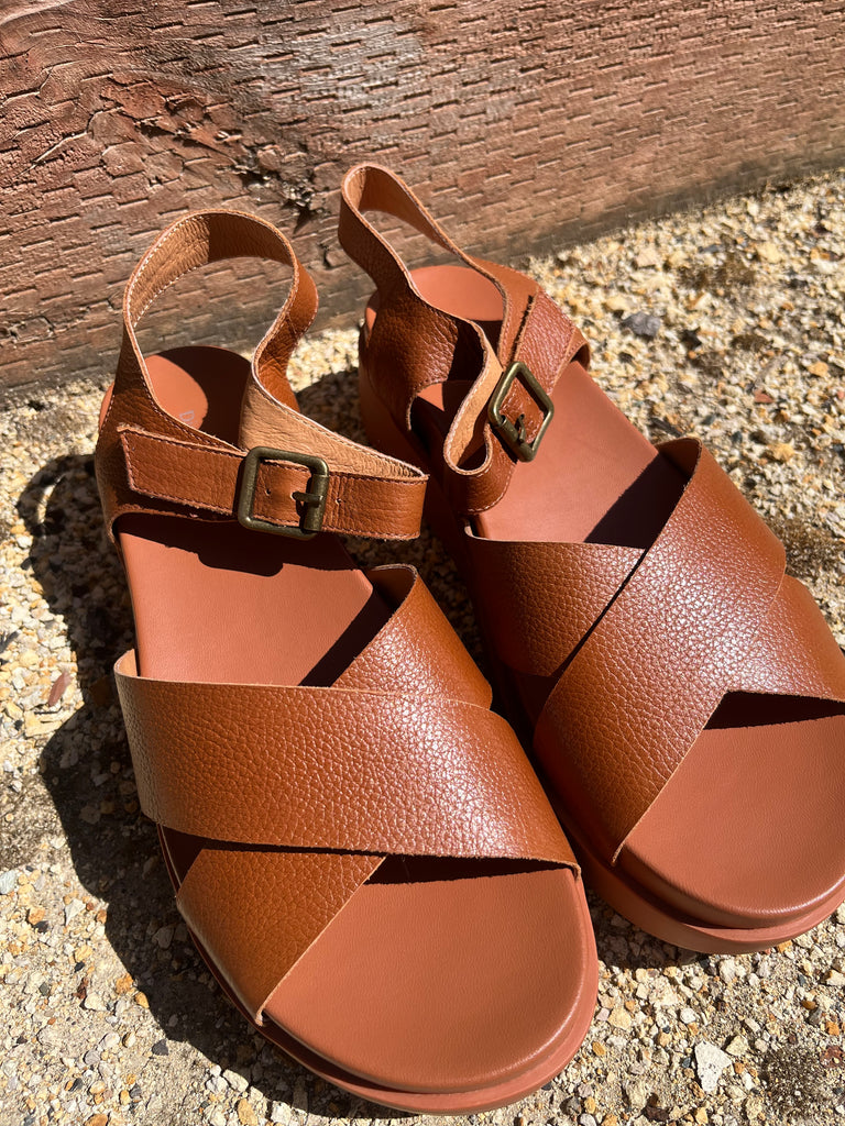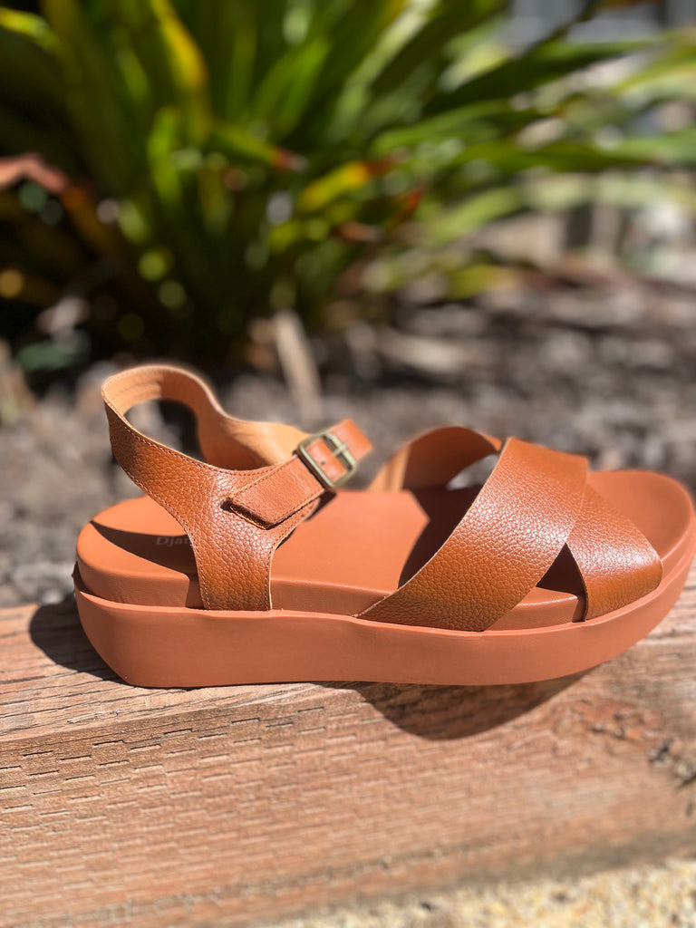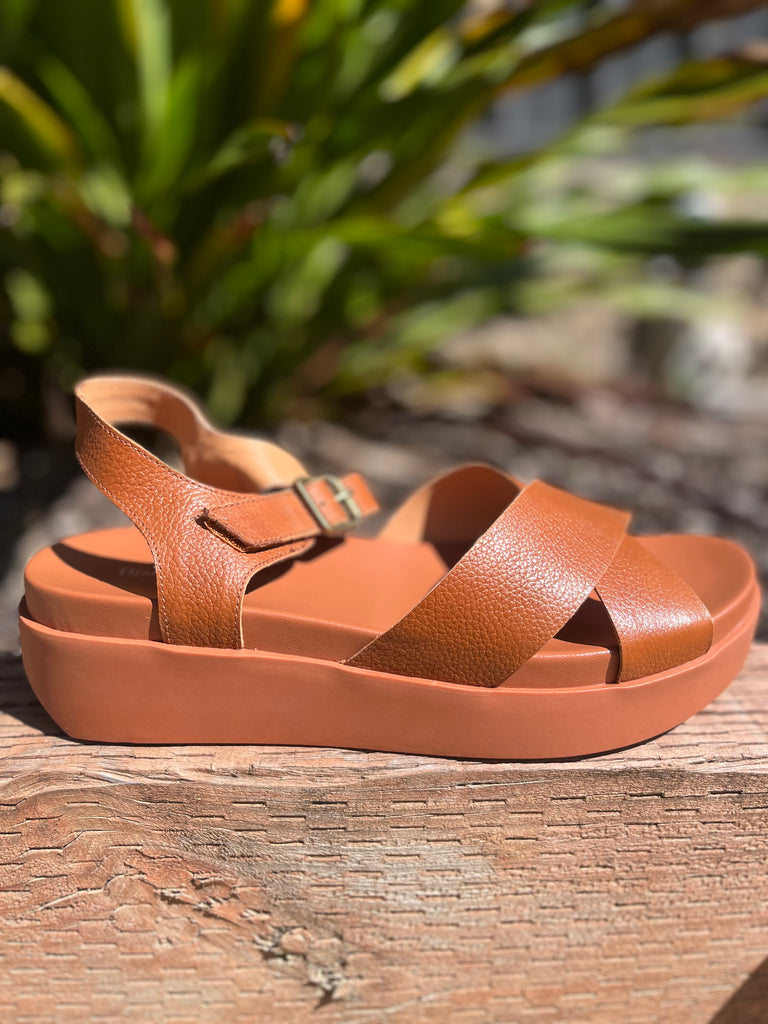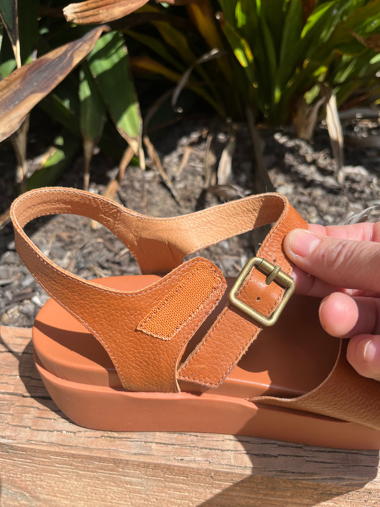 A gorgeous dark rum leather sandal with velcros strap for ease . A staple for any wardrobe this spring .
