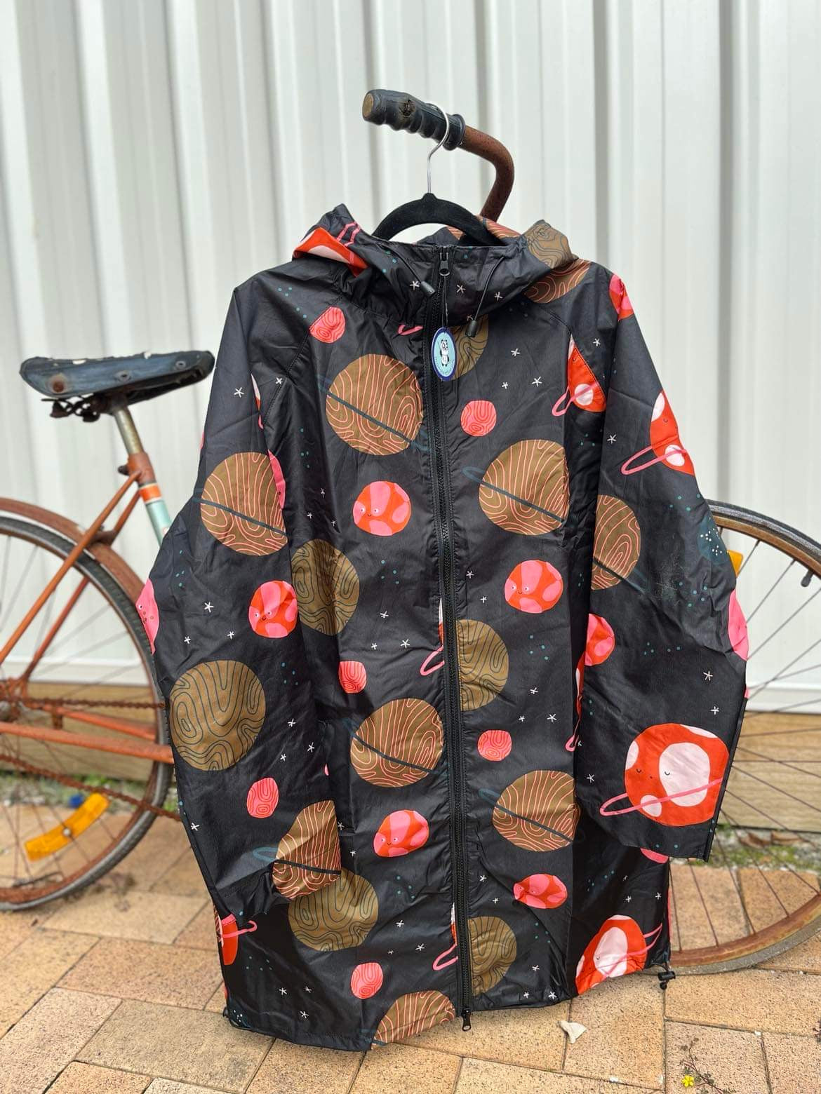 Each raincoat is water resistant and features a hood and adjustable pull toggles through the bottom to help keep you nice and dry.
