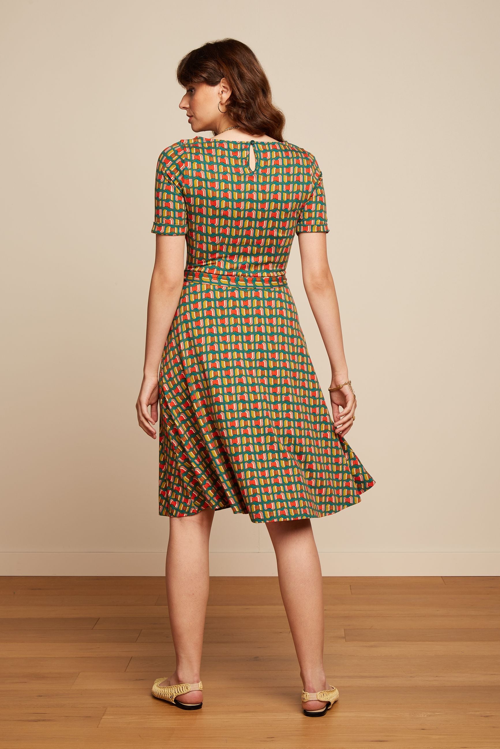 A rounded scoop neck, longer cap sleeves, gorgeous keyhole back detail, self tie belt & a-line skirt falling just below the knee.