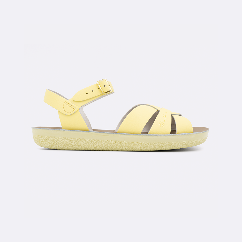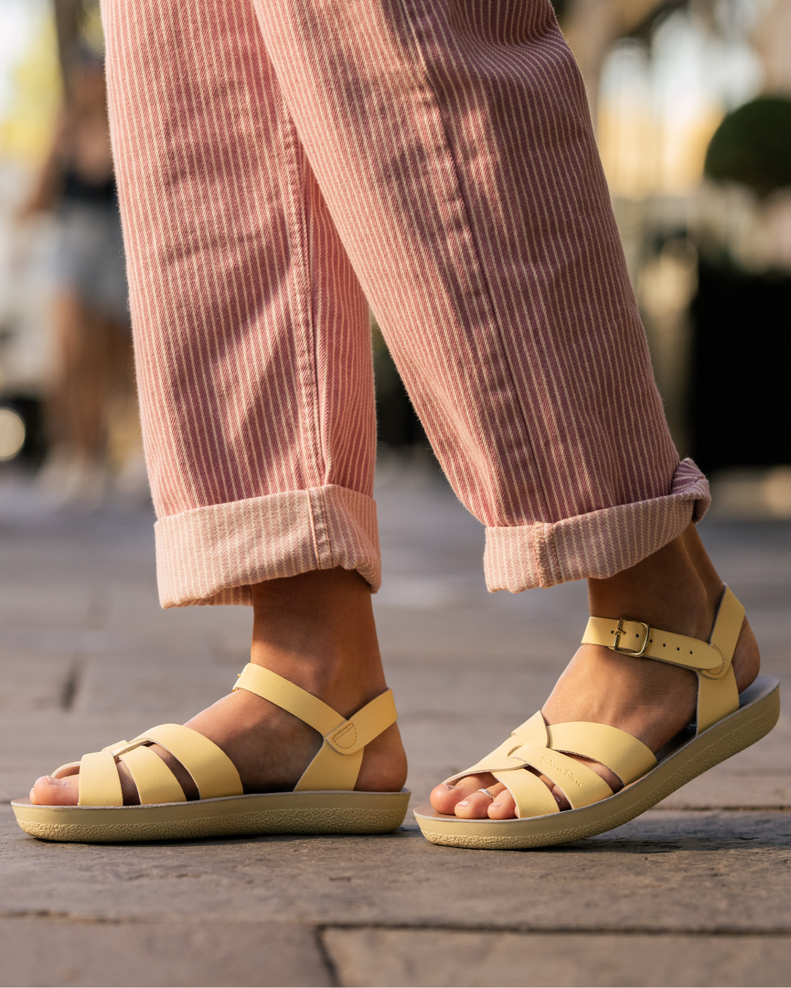 The Swimmer, now available in adult sizes, boasts a narrower fit than some other styles and comes with a lightweight, cushioned urethane sole. Rustproof brass buckles and durable, water-friendly leather make them ideal to last not only all summer long, but with care, for years to come, too. Easy to clean, hard to scuff, dress them up or down.