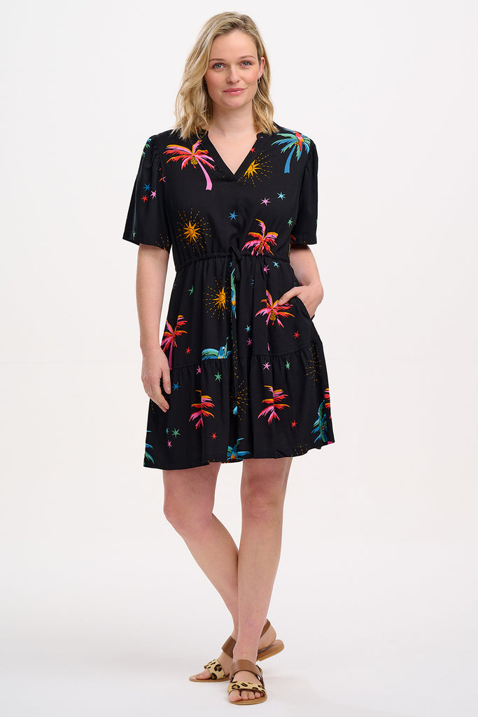 A beautifully designed dress featuring a deep V-neck cut-out and a charming tiered mini skirt, complete with short sleeves. The waist can be gently adjusted with a drawstring for a perfect fit.