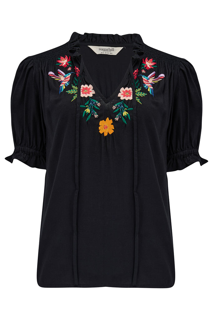 A simple Summer staple the new Angelique Blouse is perfect for work or weekend. The Angelique features shirring on the shoulders, short sleeves with shirred frill cuffs, a frill collar with ties and a flattering V-neckline. Featuring delicate floral embroidery around the neck line.