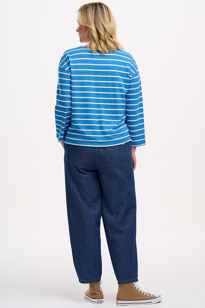 The sister to our Celine top, the Kirby Breton Tee Top is a short-sleeved version, with shoulder button detailing. Featuring a thin navy stripe throughout and a small embroidered red and pink heart on the chest.