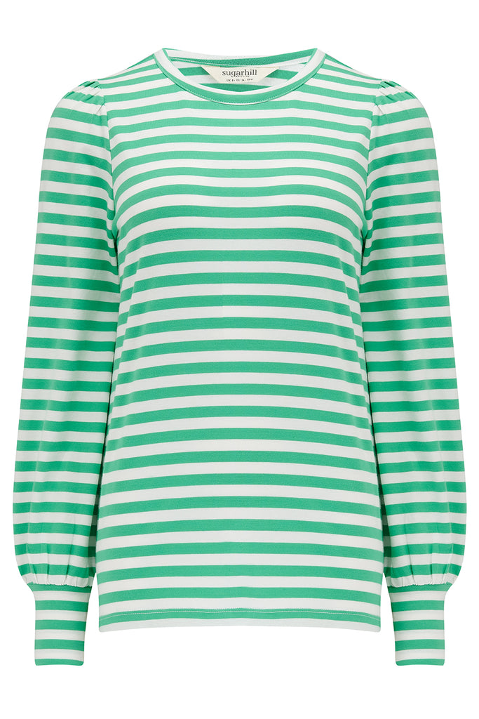 The Griselda Jersey top has a crew neck with puffed long sleeves from the shoulder, creating a blouson sleeve with an extended cuff. Featuring an off-white and vibrant green slim horizontal stripe.