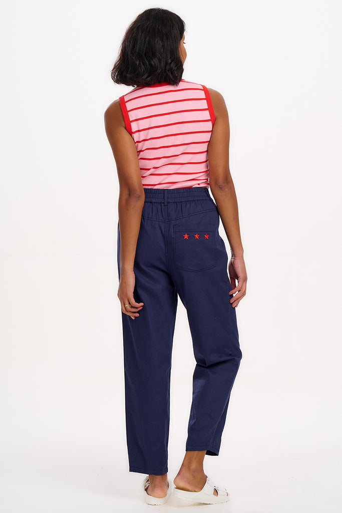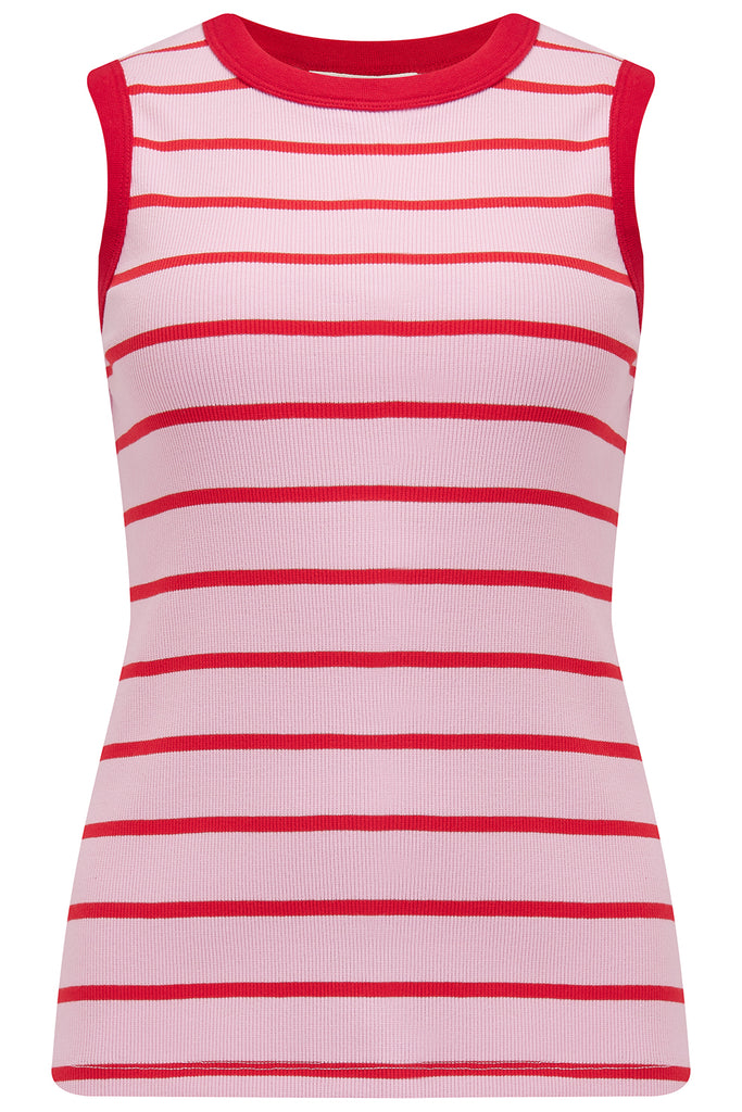 The Ruth Vest is the sleeveless sister to our new Velda Tee. A fitted vest in a ribbed jersey and contrast bands around the neckline and arm holes for a flattering 70's ringer tee vibes. Featuring thin red bands over a bubblegum pink base.