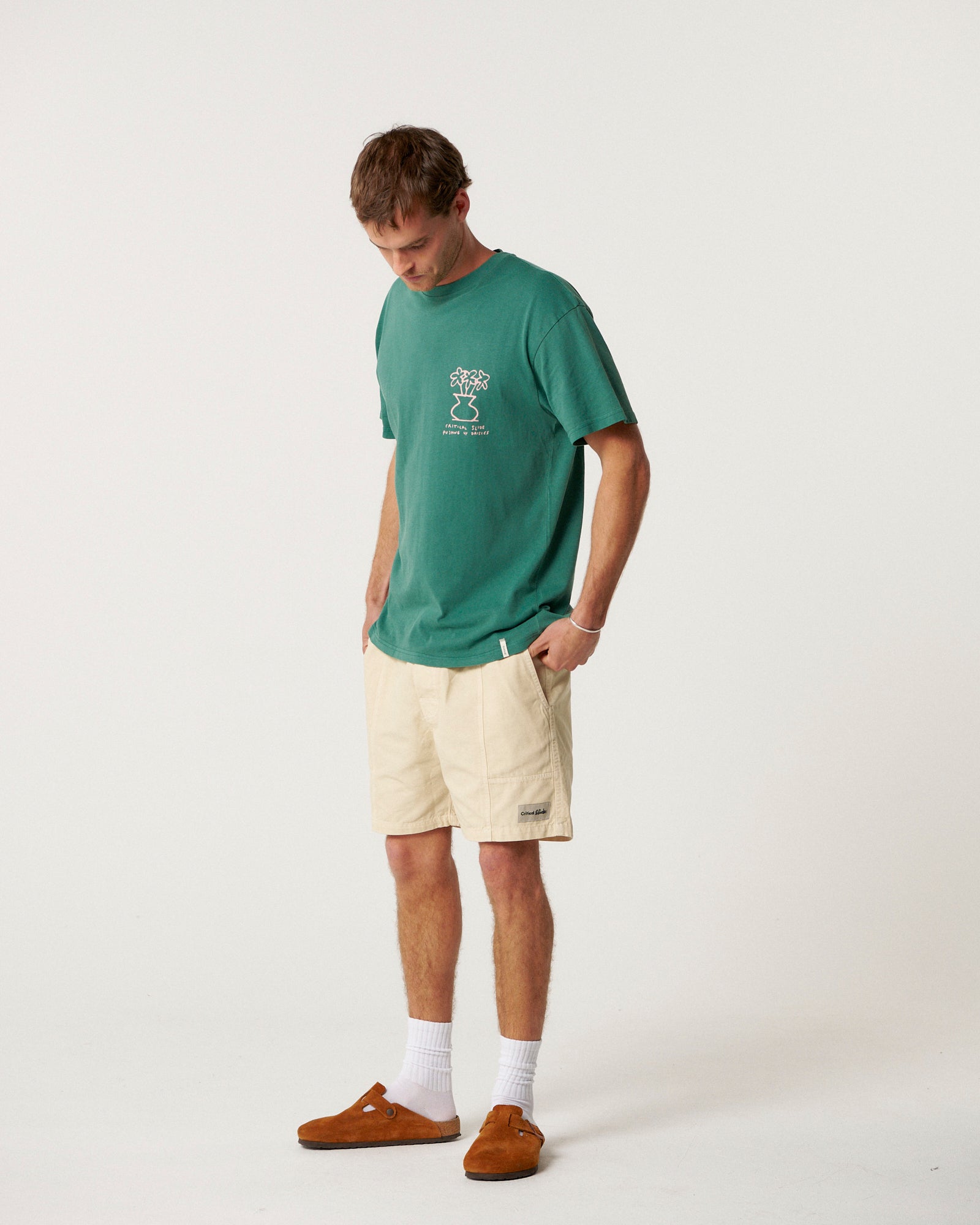 The Daisy Tee is made from 230gsm cotton singles, washed before and after make to keep shrinkage at an all-time low. Cut in our regular fit tee—which still runs slightly oversized and drops off the shoulder. Our guy is 6'1" and wearing a Large.