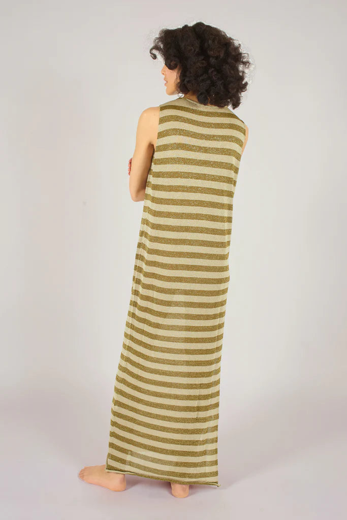The Tarnish dress is a simple sleeveless knitted maxi dress, in a beautiful stripe pattern. It's perfect for throwing over your bikini or dressing up in the evening on those summer holidays. Why not add a touch of sparkle to your summer wardrobe?