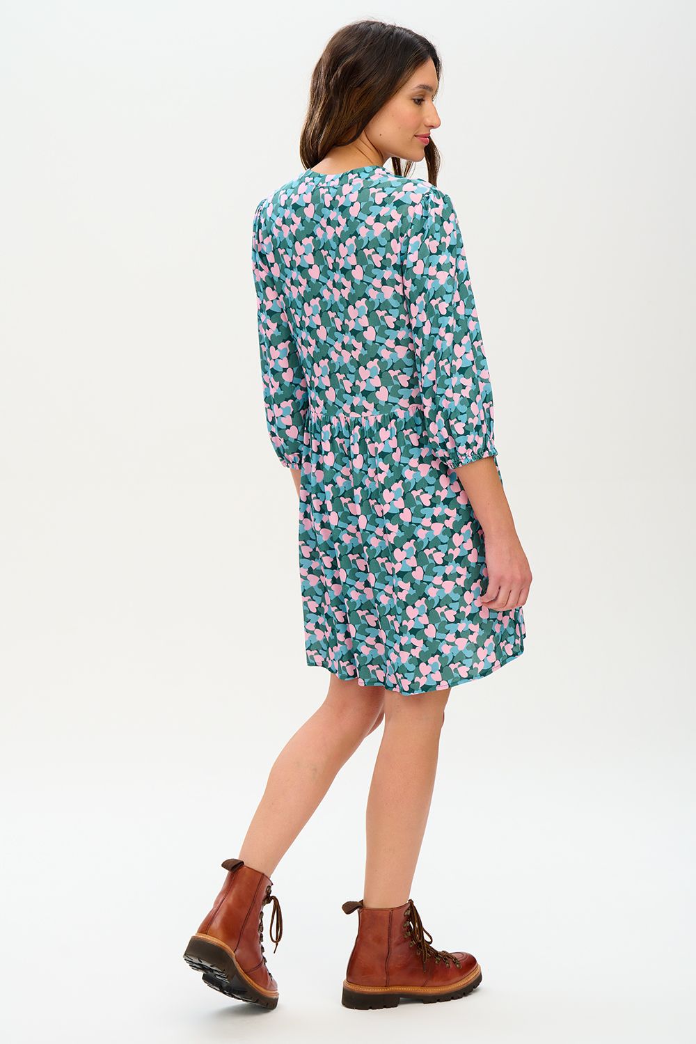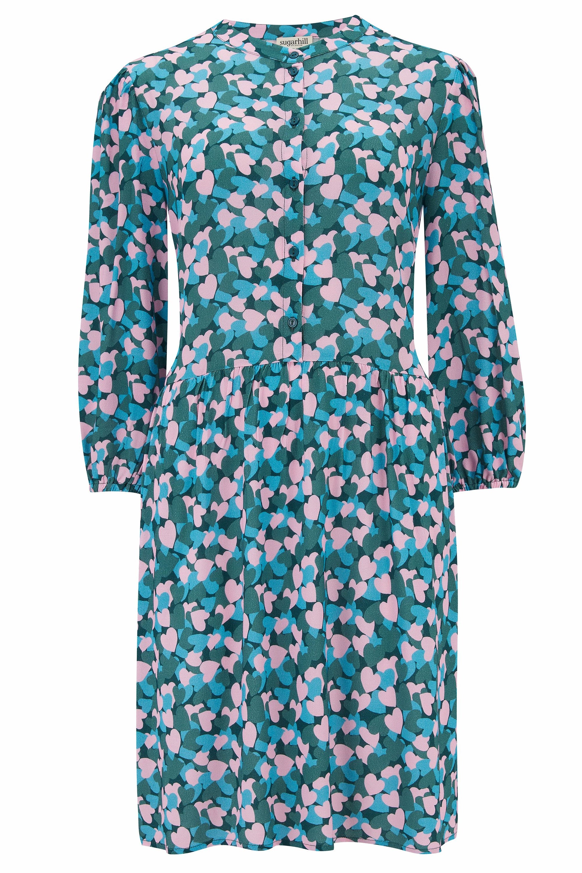 The Astra features a collarless button front, bracelet-length sleeves with a slight blouson and a full, shorter skirt - all in our romantic layered hearts print in pale pink and shades of teal.