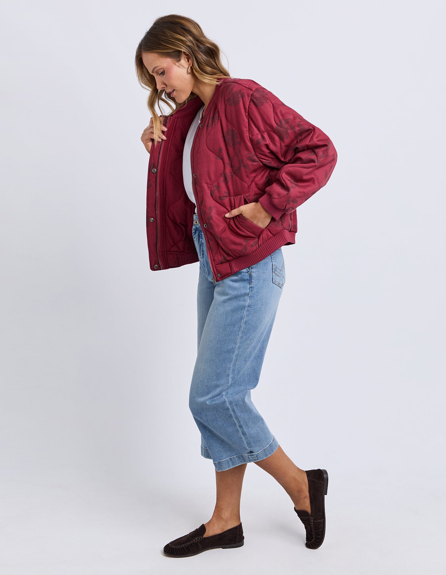The Elm Bramble Jacket combines warmth and style with its beautifully textured onion stitching. Featuring a cosy warm fill and functional welt pockets, this jacket is the perfect layering piece to complement the soft, romantic Bramble print story.