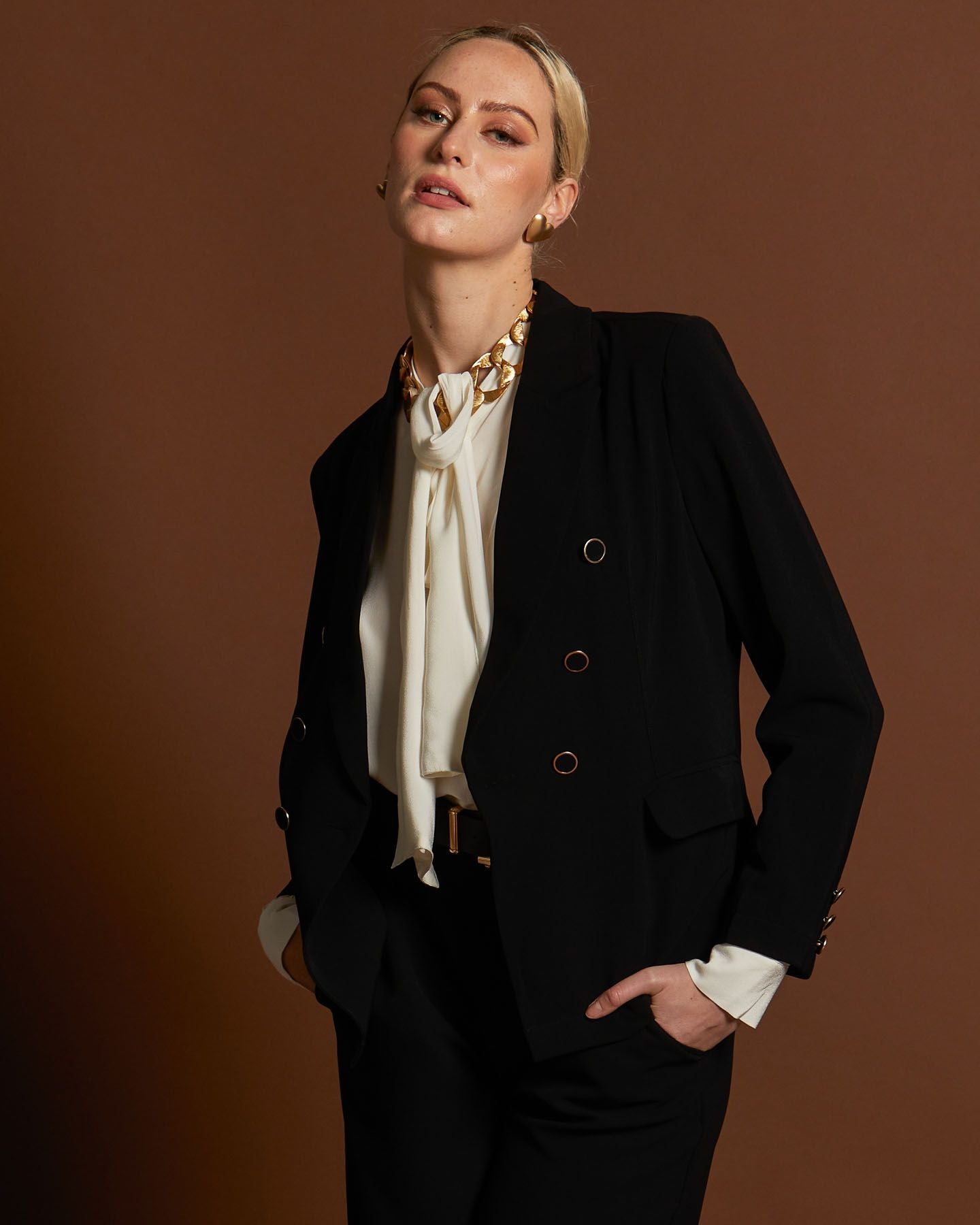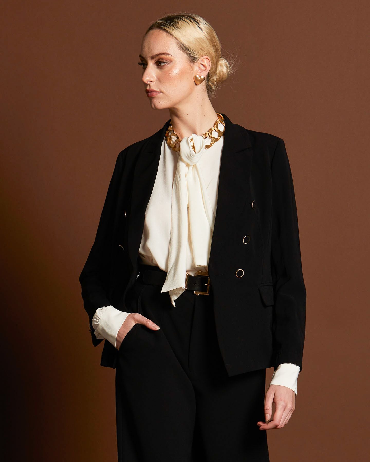 The structured shape of the blazer highlights your curves in all the right places, creating a flattering silhouette that's sure to turn heads
