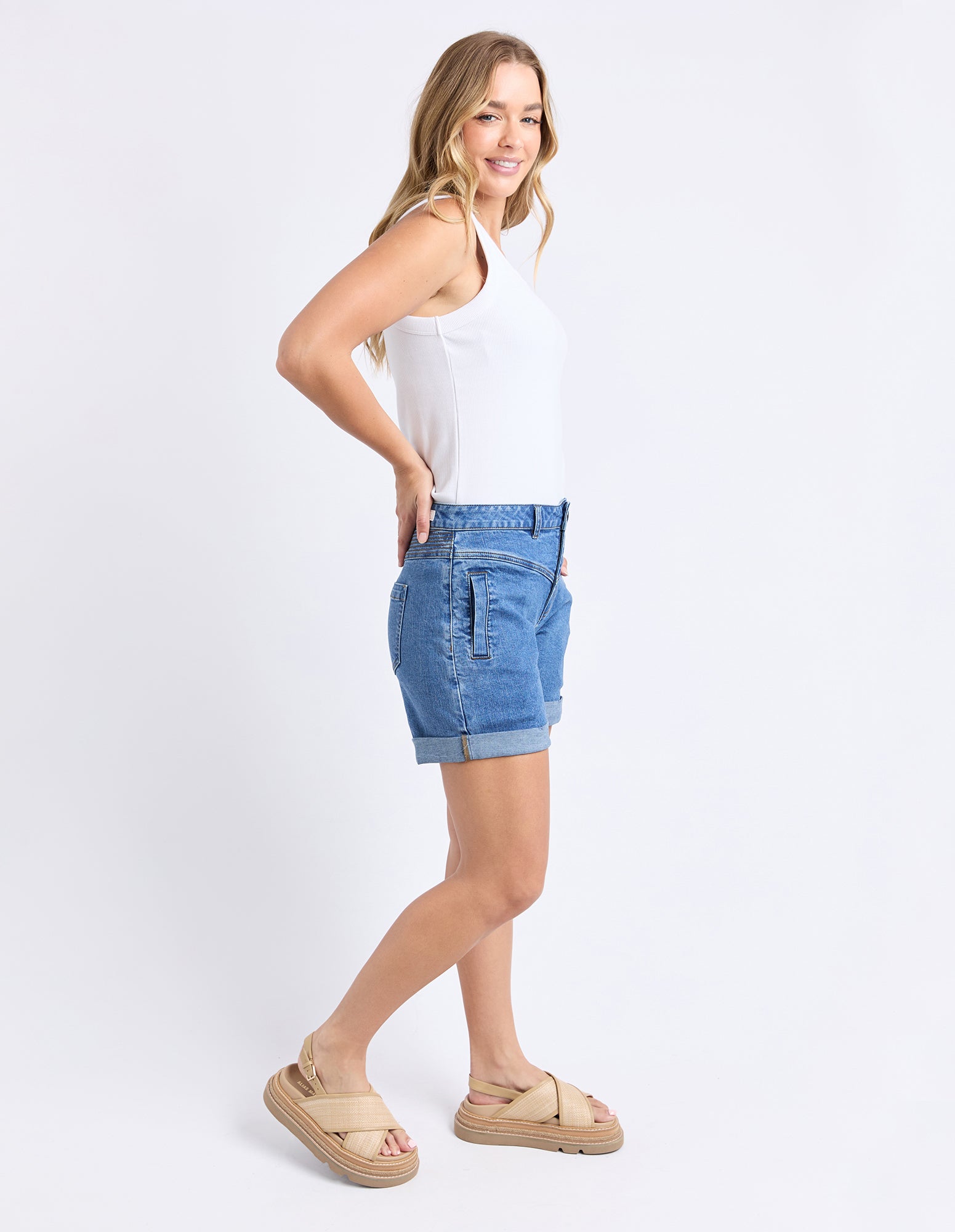 A short for work & play, the Devi Short by Foxwood features a classic fixed jean style waist. These shorts have Foxwood's attention to details applied to the yoke stitching and a cute rolled cuff to make them super special.