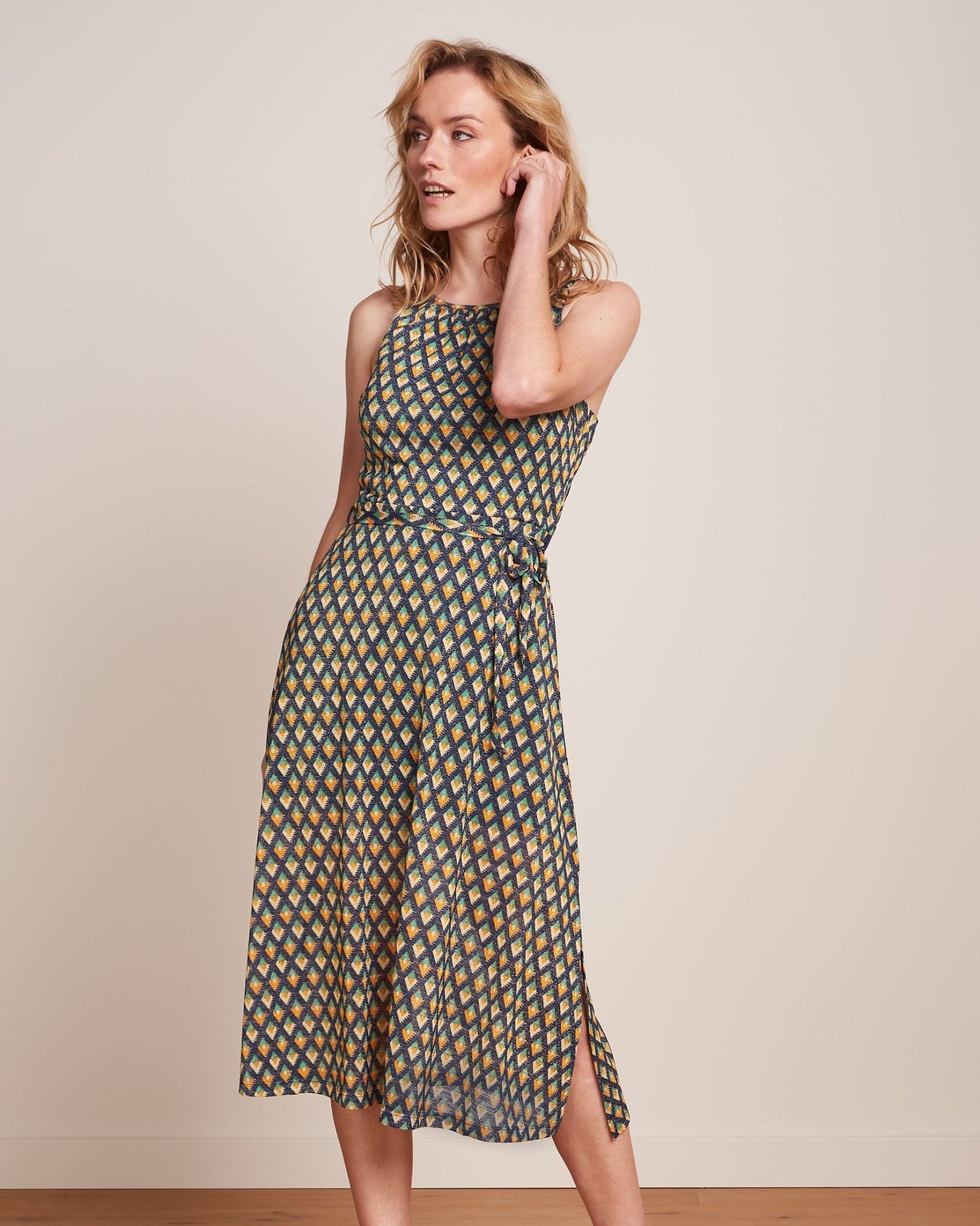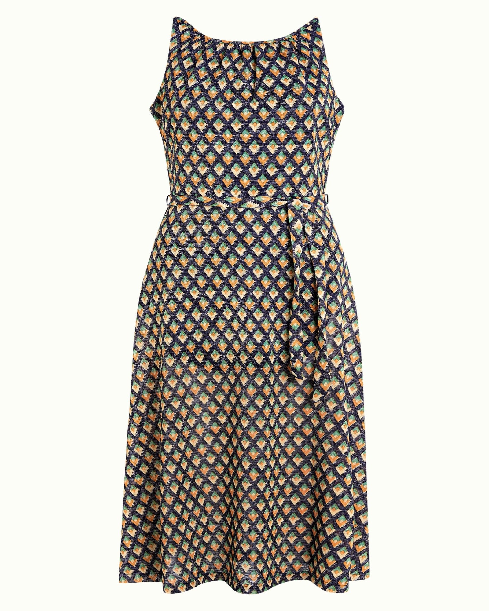 This stunning Hazel dress is your perfect companion for sultry summer nights! Made of a stretchy and supple, dark-blue fabric that is woven with Lurex and features a retro print.