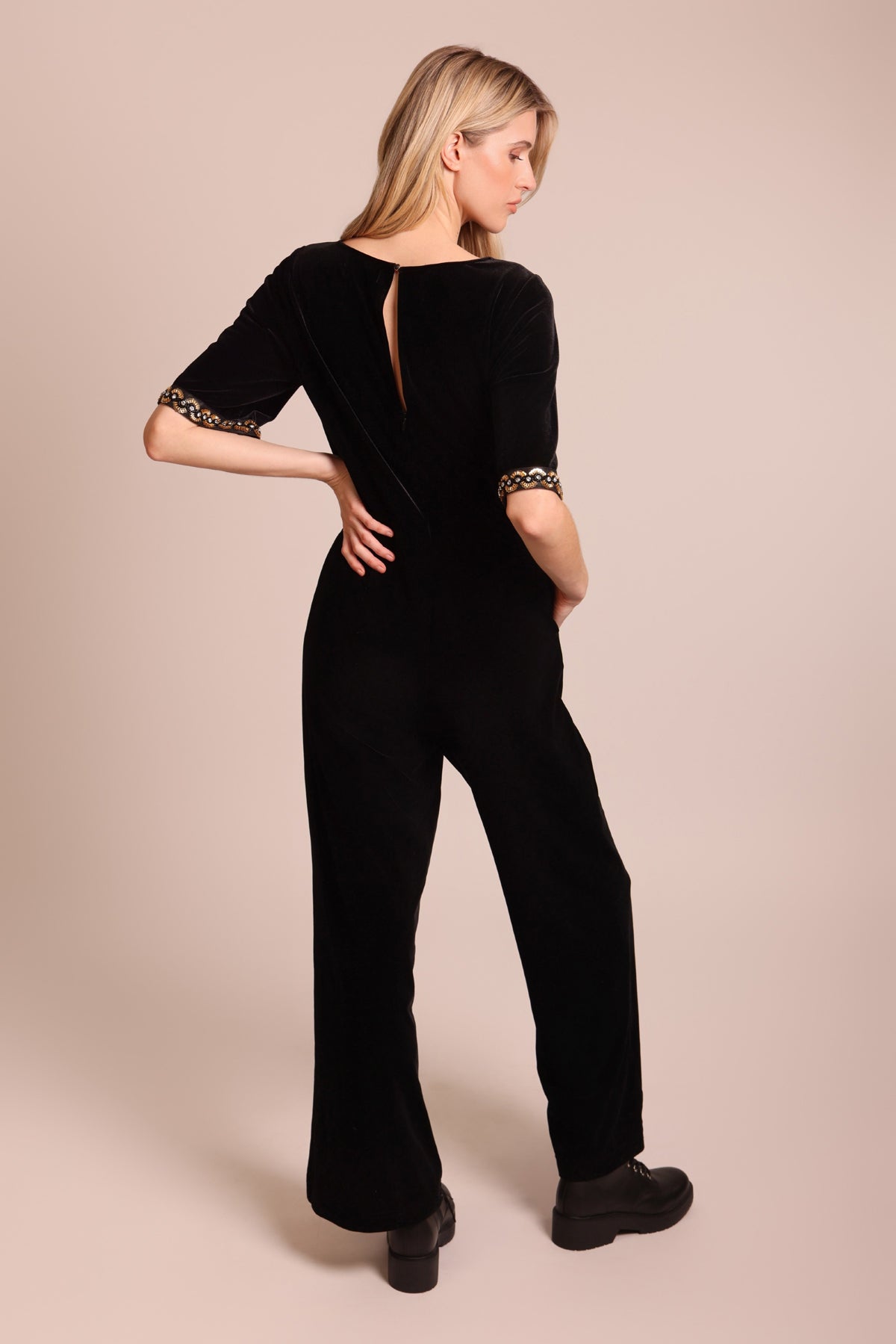 The No Going Back Jumpsuit is the perfect versatile piece to add to your Autumn wardrobe. It has the most flattering silhouette, with mid length trumpet sleeves that are finished with a stunning gold beaded embellishment. So easy to style for any occasion in this elegant soft black velvet. Just add heels for a stunning festive party outfit.